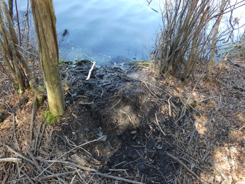 Our resident beavers are active once again. After they spent the winter inside their lodges, we caught our first glimpse of them swimming in the main pond in late March. Beavers do not hibernate during winter, though they do stay in their lodge, where they have stored enough food to last until spring. For young beavers, around 2 years old, it is time to leave the family lodge and make one of their own. Beavers are exceptionally territorial, so in the spring resident beavers build scent mounds around their territory to deter new individuals from moving in. The mounds (like the one pictured here on the edge of our main pond) are built with mud, leaves, and pond debris, then scent marked with urine and castoreum, a substance that comes from their castor sacs.
