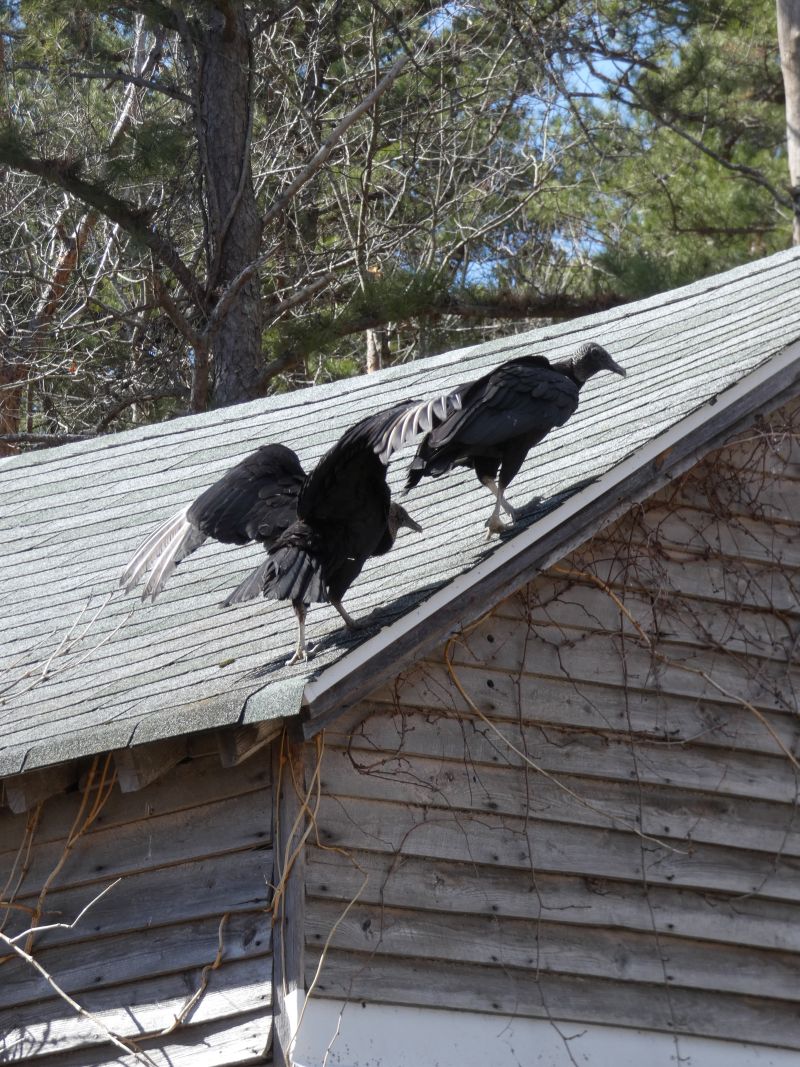 Black vulture pair cabin barn roof
