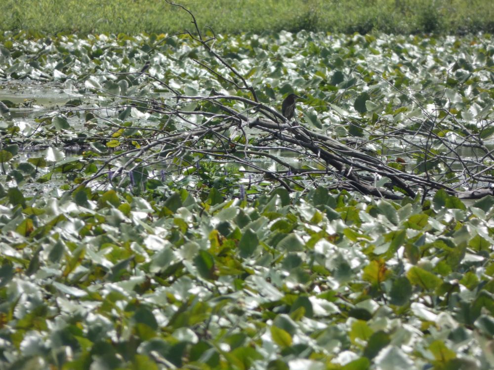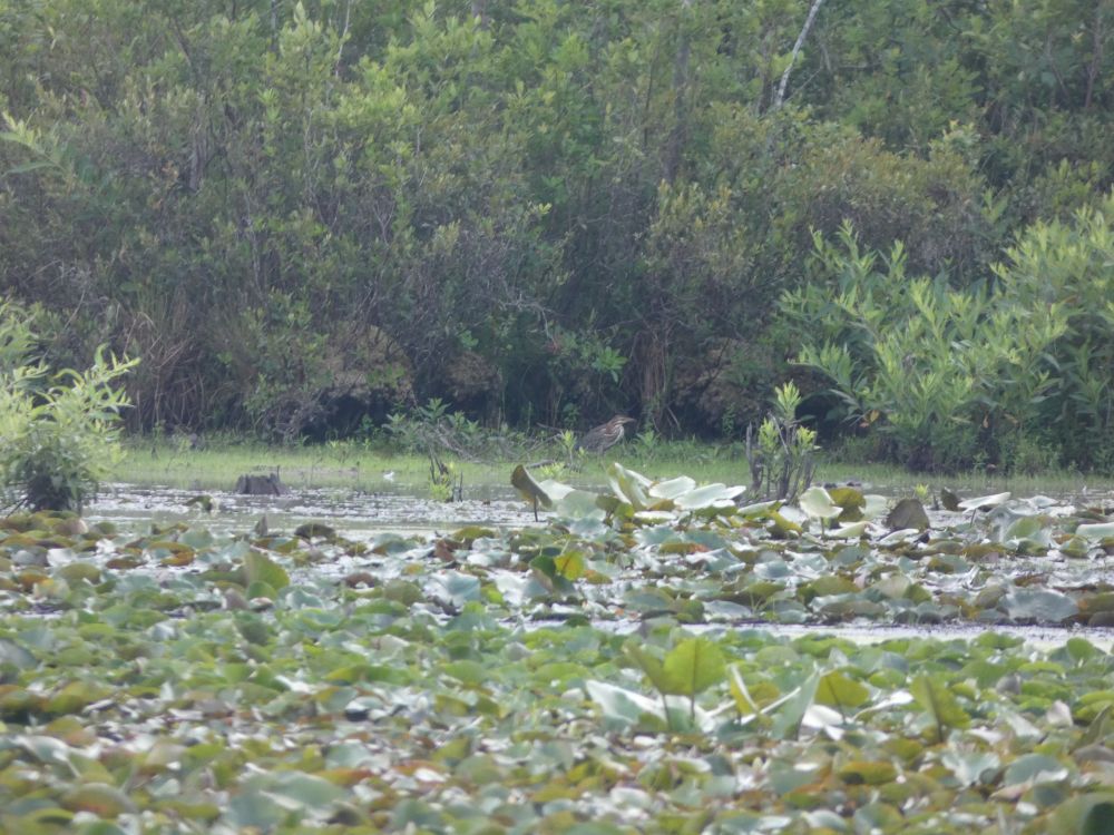 One lucky day while viewing the main pond, our manager observed two green herons. Although we had been aware of their presence at the Refuge, this was the first time we were able to document that with photographs. In the first photo we see a subadult fishing at the edge of a small island in the main pond. Subadults, not having reached full maturity, do not have full adult plumage and coloration, but rather have a more mottled brown coloring. In the second photo an adult green heron is perched on a branch. The adult has more solidly colored feathers with a deep green back and crown, and a chestnut neck and breast.