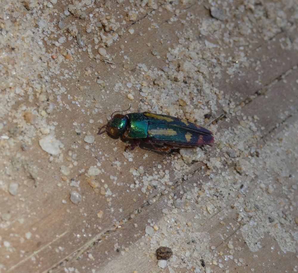 Nature never ceases to amaze in its uniqueness and beauty, especially not when this eye-catching jewel beetle made a stop on the stairs of Headquarters. The red-legged buprestis is one of many species of jewel beetles who are named for their brilliant colors and metallic sheens. Those colors help protect them from predators by acting as camouflage, allowing them to hide in plain sight. The color of the carapace is not due to pigments in the shell, but due to light diffraction by the microscopic structure of the carapace. Found in open, sunny locations during the summer, they are wood boring beetles inhabiting dead or dying hardwood in their adult phase.