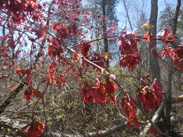 This juvenile male cardinal spent some time perched on a log near headquarters, grooming and taking in the scenery. Although not yet at full maturity, soon his coloring will be the more solid and bold red of an adult male. Another dimorphic species, females and males can be easily distinguished from one another based on coloration as females are mostly light brown. As with many bird species, the males are more brightly colored, a characteristic that helps with mating as it serves to attract a female. Young males in the early stages of transition can be mistaken for females as they have similar coloring, though adults' beaks are brightly colored while juveniles' are black or gray. The beak of the young male pictured here has already changed from dark to more brightly colored, another indication that he has almost completed the transition.