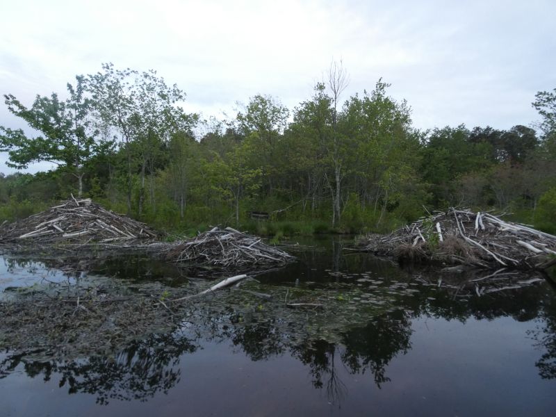 The south side of our main pond has an active beaver population with at least three lodges, and numerous dams. Beavers build dams to slow the flow of water in streams and rivers, they then build stable lodges for shelter in the ponds created. They are quite selective when choosing a location for a lodge, usually settling close to a food source. Lodges consist of walls made of sticks and mud, a floor, and an access door. Water depth of up to five feet is preferred below the lodge, allowing them to exit safely into the water without being seen. Lodges can vary in size, sometimes housing up to nine beavers in one dwelling. Each year they will add sticks and mud to the walls, helping to fortify its construction and add proper insulation for the cold months.
