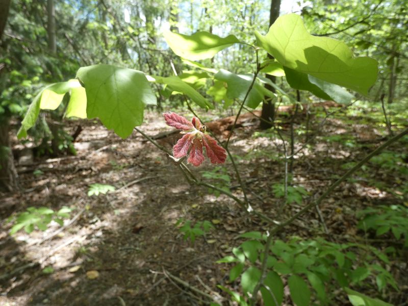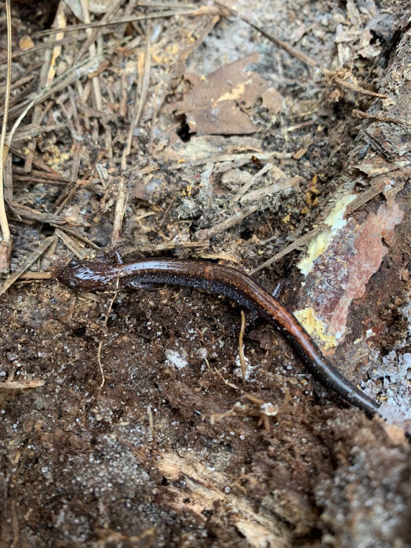 This red-backed salamander was spotted among the leaf litter off of the boundary trail after removing a Mylar® balloon to be discarded. Members of the family Plethodontidae, they lack lungs, which means they need to live in damp or moist habitats to breathe. They are native to the eastern United States and Canada, and can occur in two color phases, lead-back and red-back. The lead-back phase salamanders are a consistent gray to black color while the red-back phase is characterized by an orange to red stripe down the length of their body and tail. They are often found in or under logs, leaf-litter and burrows of deciduous forests. In colder months, they burrow under the frozen ground surface.