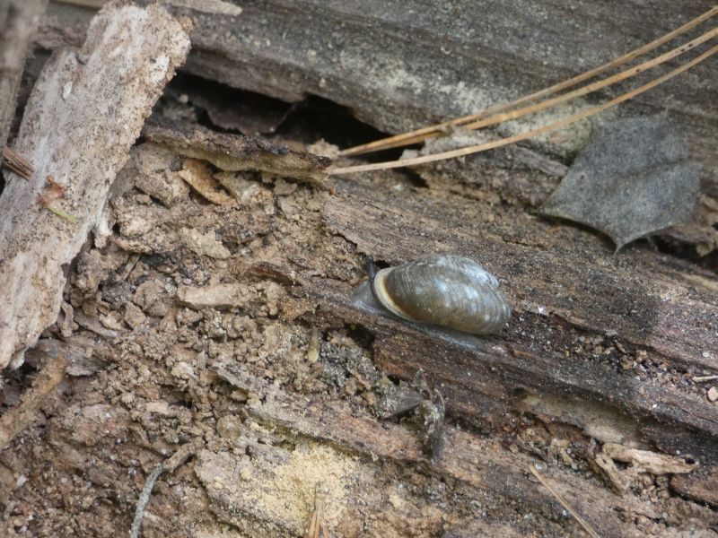 This snail was photographed on a decaying log near Headquarters this past spring. Snails are decomposers, specifically detritivores—animals who feed on dead organic material, especially plant detritus. Having evolved to eat just about anything, they also eat fungus, animal waste, and small insects. There are over 100 species of terrestrial snails in the state of NJ. Snails are a type of gastropod mollusk--lacking internal bones and a skeleton--leaving their shell to protect their vital organs and provide a place of refuge. They secrete a sticky mucous, which creates a trail, aiding in their travel over assorted terrain, allowing them to move without harming their delicate skin.