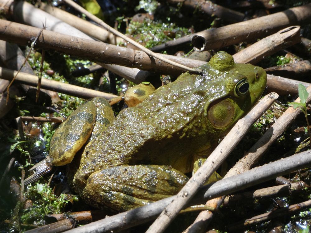 American bullfrogs are usually quick to retreat when they perceive a threat such as our intrusion into their world so we do not always have the opportunity to see them up close. By the time we are close enough, they have already jumped into the water and out of sight. They can easily jump a distance of up to two meters, though generally the average is about one meter. Females and males can reach a body length of 15-20 cm, with females typically being larger than males. They have variation in color with light to dark shades of green and brown, and can be solid or spotted. On this day at our main pond, we quietly photographed these two individuals less than a meter apart from one another. Notice one is a lighter green with some faint, sporadic spotting and the other is a darker green-brown with a bolder spotted pattern on the hind legs.