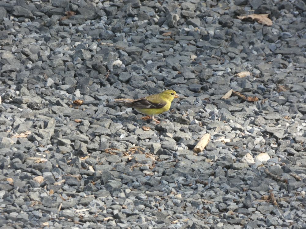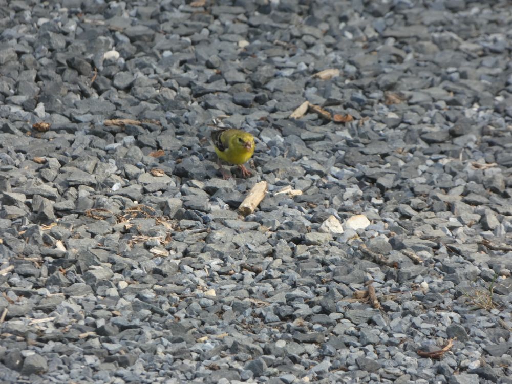 While relaxing on the front porch of the new Headquarters building late one afternoon, our manager enjoyed a quick visit from this female American goldfinch who dropped by to forage for food amongst the gravel of the driveway. The American goldfinch is a granivore, their main source of food being seeds, though they may also feed on certain types of bark, vegetation and small insects. It is likely this individual nests close to Headquarters as she and her mate have been spotted together there a few times. Nesting during July and August, the female goldfinch builds a compact cup-shaped nest, usually in deciduous shrubs or trees. While she incubates the eggs, her mate will feed her, and when hatchlings emerge, both parents will care for their young.