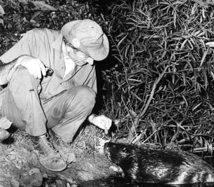 One day, my mother, who was always more patient than I, told me of a spot along the stream bank below the main pond where she had seen a mother otter and at least two pups. She advised that, if I went there very early in the morning and was particularly patient and did not fidget too much, I might get to see them. I took her advice, sat patiently in the cold and waited. Within a few minutes (a relief to a teenager with a relatively limited attention span), I saw the mother otter come out of her den and look around for danger. She then quickly disappeared back into her den and I thought she must have considered me a threat despite my valiant effort at remaining motionless, and almost got up to leave. But, to my delight, the next thing I knew, two pups emerged from the den and slid into the stream, followed by the mother. I spent many minutes watching the pups play in the water while 'mom' diligently watched out for danger. I could not have asked for more.