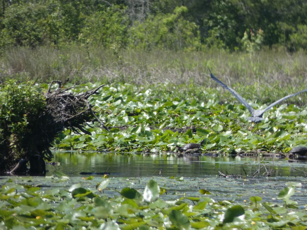 One sunny day in early summer, this great blue heron seemed to enjoy the vantage point provided by a tree stump in our main pond. At least one mated pair nests nearby. We often see them fishing in the pond or perched in the surrounding trees. We are also regularly alerted to their presence by their distinct call. In the first photo, she has her beak open allowing us a view of the tongue. Bird tongues have adapted to be specialized for specific diets. A great blue heron's tongue helps them consume a varied diet of fish, amphibians, reptiles and mammals. The birds are over one meter tall, with males being slightly larger than females. Their wing span, sometimes over two meters, can be appreciated in the second photo as she flew off, passing over a few resident turtles resting on lily roots below.