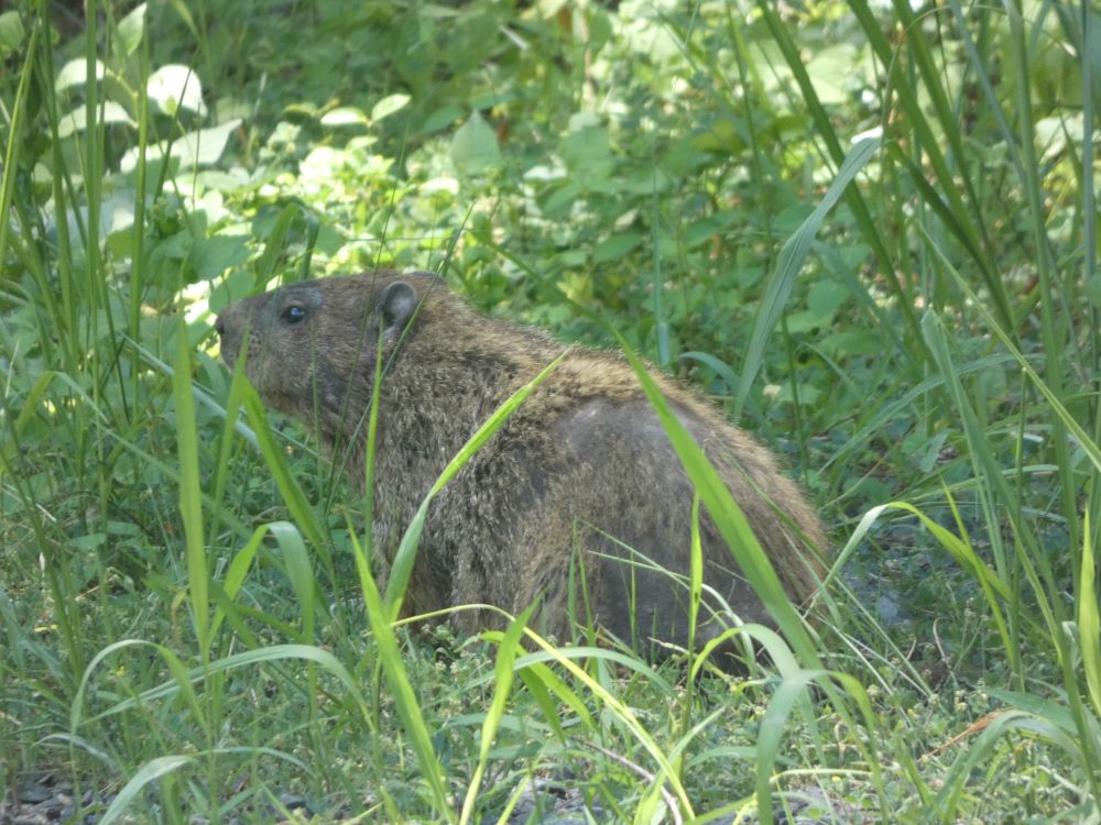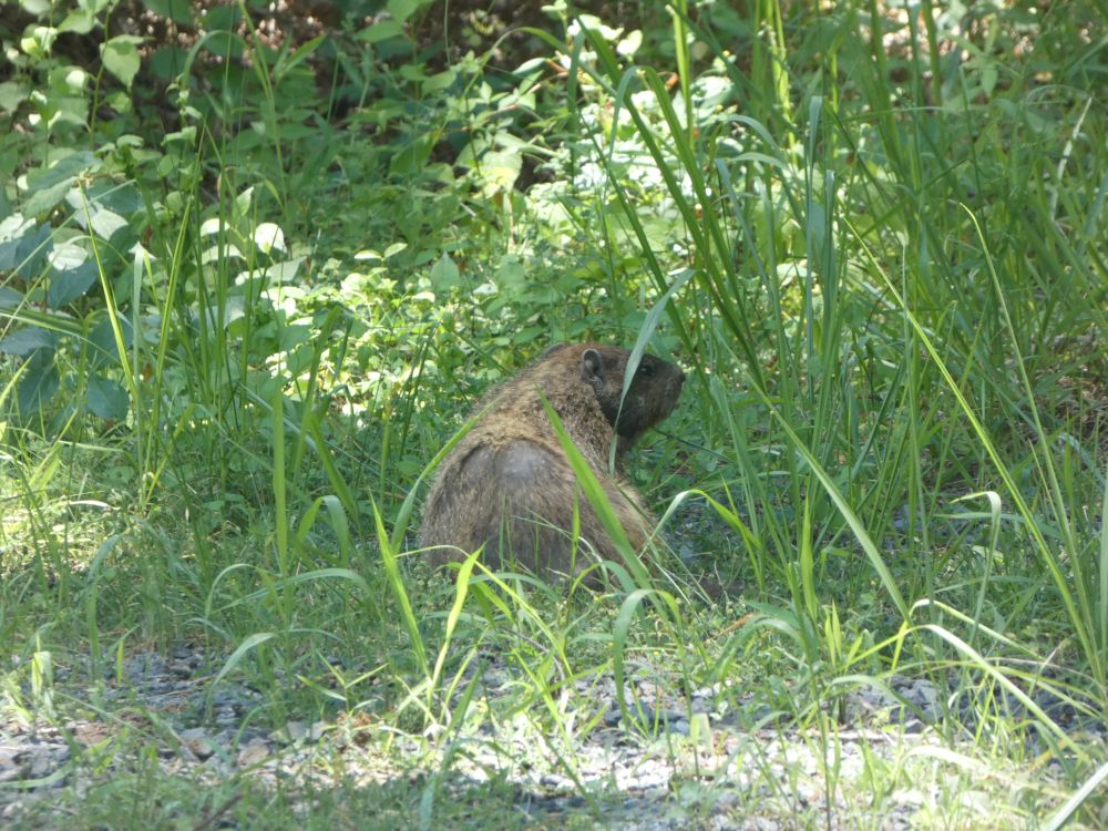 We were happy to see our resident groundhog emerge from her burrow behind Headquarters this season as we were unsure if she had chosen a new site in the confusion and activity of the cabin demolition and new building construction. Groundhogs are generally active until the first real frost, usually in October or November, at which point they begin hibernation in their burrows until the weather warms up around February or March. On a few occasions over the summer, we were lucky enough to see at least one of this mother's pups exploring and becoming familiar with the surrounding area aboveground in preparation for when he or she would eventually set off on their own. The fur loss (alopecia) in the mother may be from skin parasites, but could be from a variety of other causes, and letting 'nature take its course' is ultimately the best thing for wildlife.